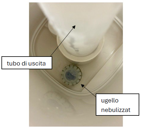 Per completare il montaggio, la membrana blu più grande deve essere inserita sull’estremità sporgente del tappo nero. A questo punto è possibile rimontare l’ugello nebulizzatore e il tubo di uscita.